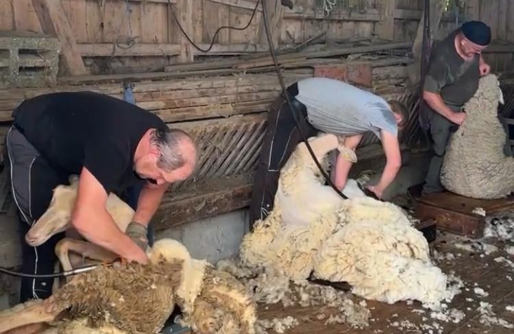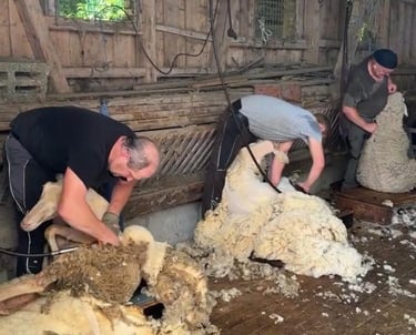 Einmal im Jahr werden die Schafe geschoren – ein besonderes Ereignis, das häufig direkt im Stall stattfindet. Die Schur wird meist von speziell angereisten Fachleuten durchgeführt, die diese Aufgabe mit viel Geschick und Erfahrung übernehmen. Dabei liefert jedes Schaf bis zu 5 Kilogramm Wolle. Anschließend wird die Wolle grob nach Farben sortiert und sorgfältig verpackt.